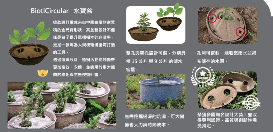 BiotiCircular 水寶系列 提供了一種低成本、可持續且可擴展的植栽解決方案,幫助幼苗生根,透過提供水源與遮蔽,促進健康的根系發展,讓植物能夠深入地下水層以獲取養分。